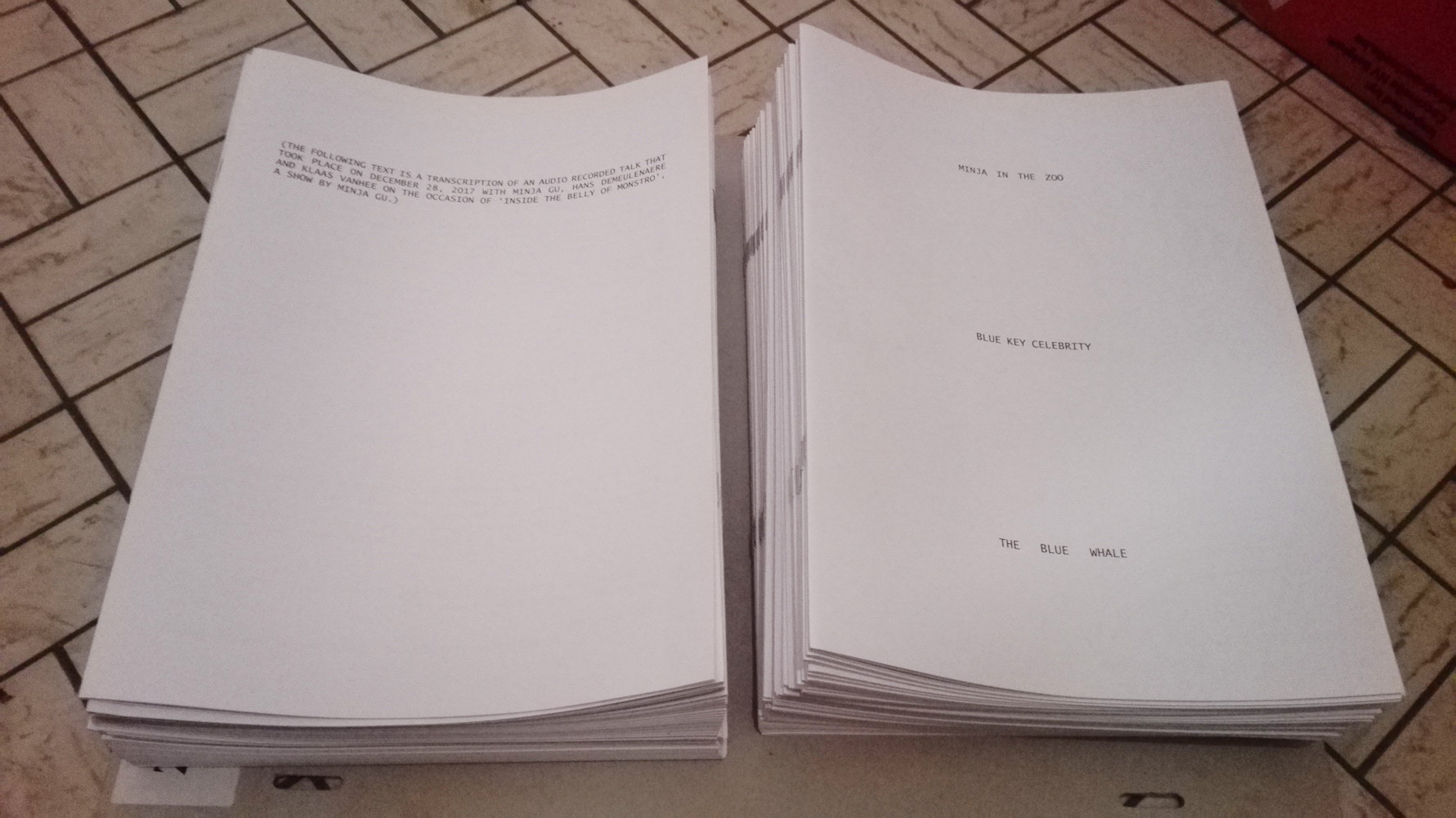 Minja in the zoo by Hans Demeulenaere & Klaas Vanhee. A printed contribution on the occasion of the opening ‘Inside the Belly of Monstro’, a show by Minja Gu, published in an edition of 250 copies, 33 pages, text and editing: Hans Demeulenaere & Klaas Vanhee, drawings: Klaas Vanhee, layout: Thomas Desmet